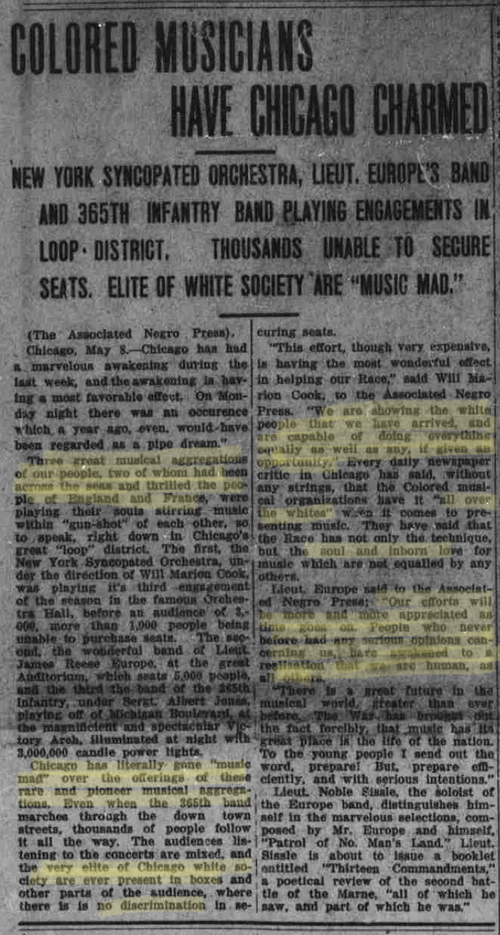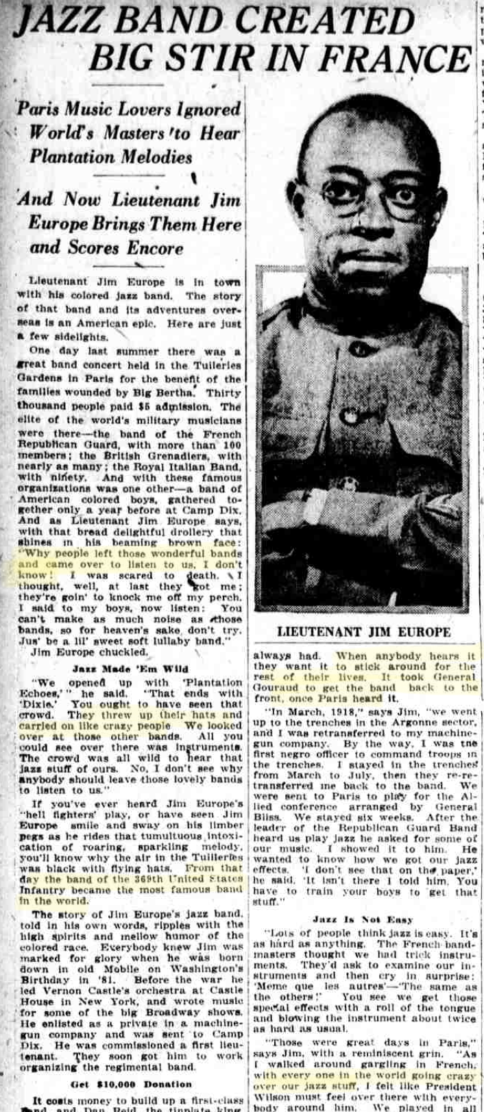 "Colonel Hayward has brought his band over here and started ragtimitis in France; ain't this an awful thing to visit upon a nation with so many burdens? But when the band finished and the people were roaring with laughter, their faces wreathed in smiles, I was forced to say that this is just what France needs at this critical time."