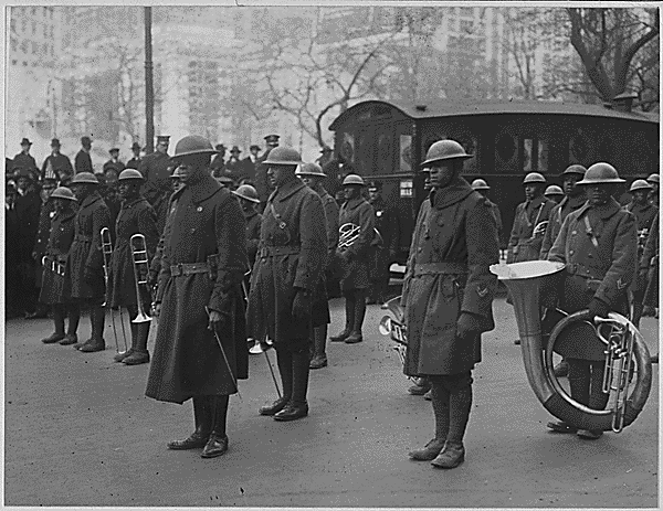 "Lieutenant James [Reese] Europe and his famous band of the 369th Infantry in the parade in Fifth Avenue. Lieutenant Europe's famous band was known as the best in the American Expeditionary Forces in France. General Pershing borrowed it for a month. It also took part in the 4th of July celebration in Paris.". February 17, 1919. National Archives