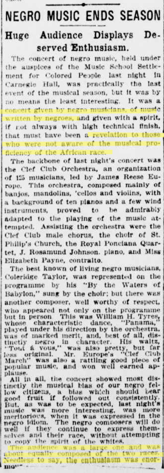 " Europe had stormed a bastion of the white cultural musical establishent and made many members of New York's cultural elite aware of Negro Music for the first time."