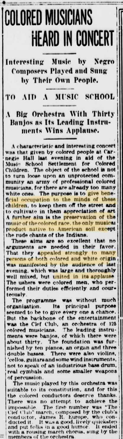 Jim Europe led the Clef Club Symphony Orchestra at Carnegie Hall on May 2, 1912. This was the first time an African-American ensemble played African-American music in the renowned hall.