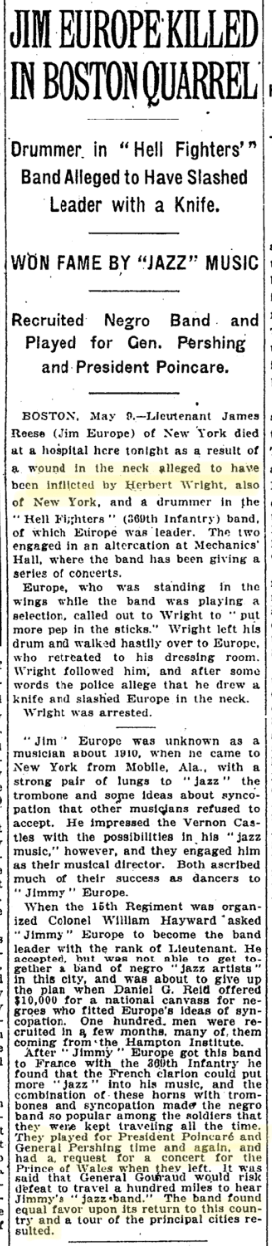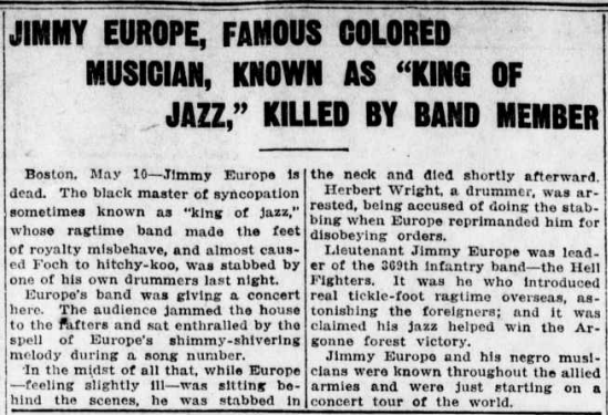 "Lieutenant James Reese Europe (Jim Europe) died at a hospital here tonight as a result of a wound in the neck alleged to have been inflicted by Herbert Wright, also of New York