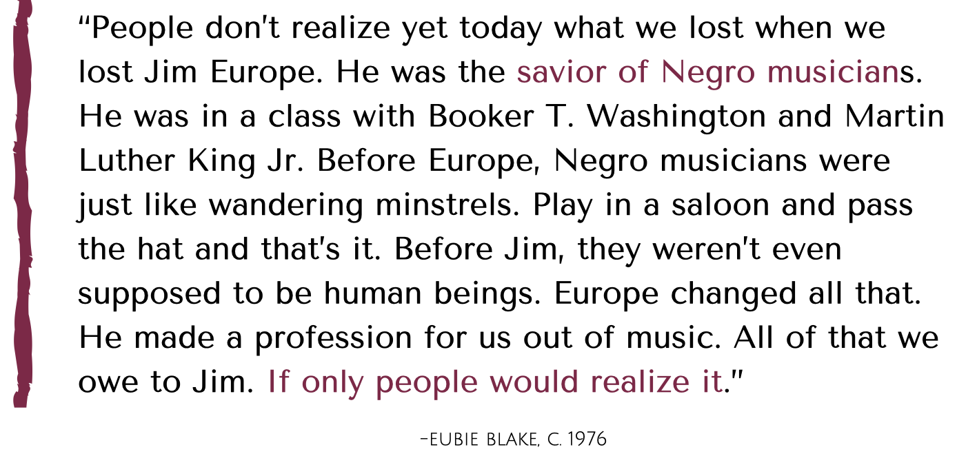 "Before Jim Europe came to New York, the colored man knew nothing but Negro dances and porter's work. All that has been changed. Jim Europe was the living open sesame to the colored porters of this city. He took them from their porter's places and raised them to positions of importance as real musicians. I think the suffering public should know that in Jim Europe, the race has lost a leader, a benefactor, and a true friend."
