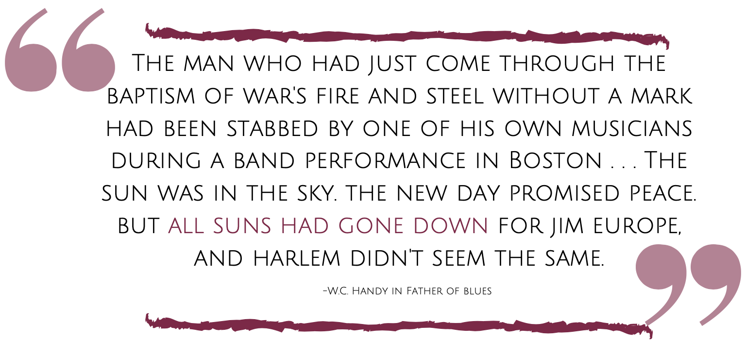 On May 9, 1919 James Reese Europe was stabbed by a volatile drummer, Herbert Wright, at Boston’s Mechanics Hall. Although first believed to be a superficial wound, the stab was fatal and stole the trailblazer’s life.