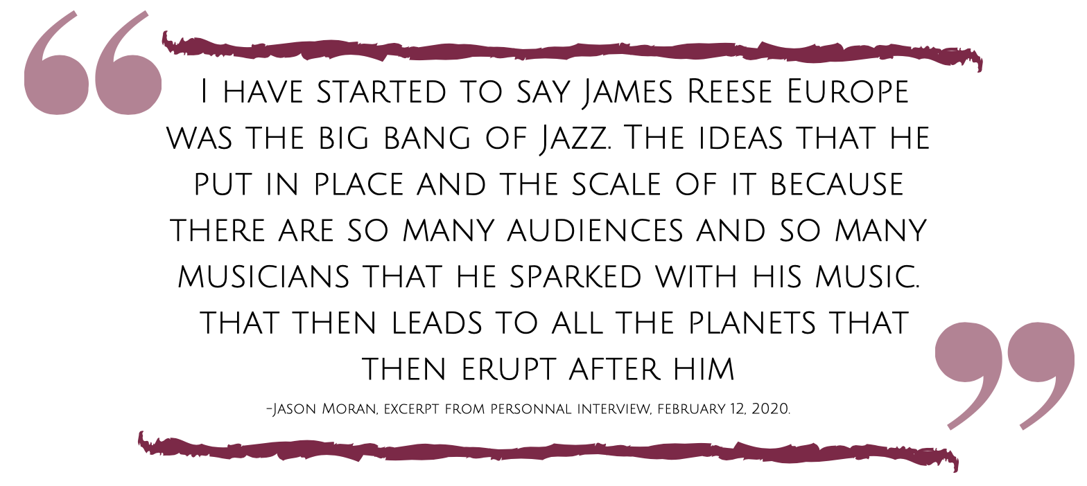 Though his life was cut short, James Reese Europe acted as a hero for African-American musicians. He broke barriers which had long restricted African-Americans, and due to his efforts, African-American musicians received proper recognition and compensation for their talents. Not only were there new standards for how a black musician should be treated, he proved the merit of African-American soldiers in battle. Furthermore, he lifted a once-tarnished genre beyond mere respectability to one that epitomized a decade, and he spread a uniquely American art form across continents.